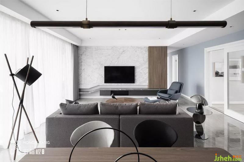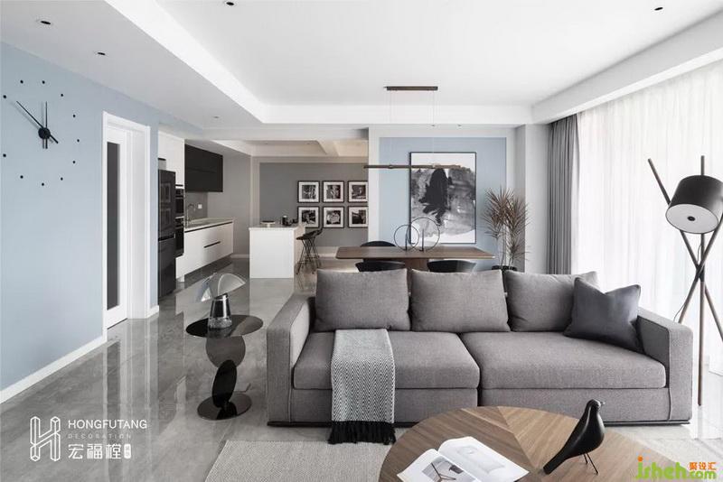 室内设计师在客厅选用月光蓝搭配白色使用,安静祥和,除了墙壁挂钟设计,没有多余的摆设,从一个方面反映了业主的职业特点,知性冷静。将客厅想象成数学课程,不多不少,每一个物件都有在此出现的实际意义。