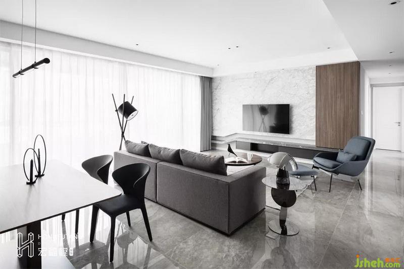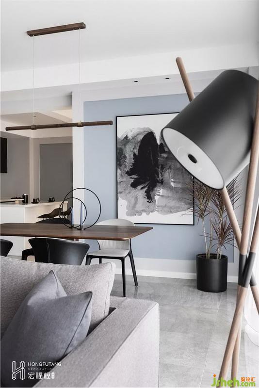 客厅与餐厅位于同一个空间内,依靠沙发背景自然分界,相互独立,互不干扰。