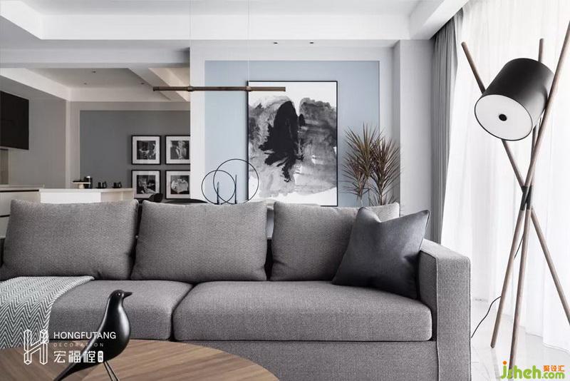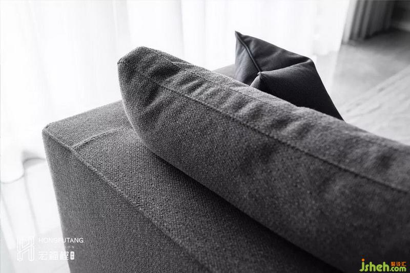 选用豆沙灰布艺沙发,色彩搭配上与整个空间气质相符,从材质上,肉眼可见的粗颗粒更有质感。难得出现的暗色调,强调空间视觉重心。