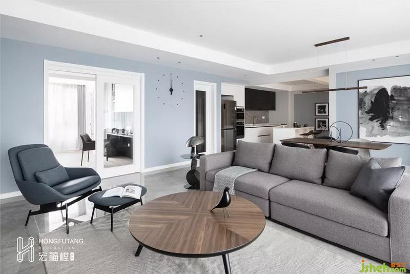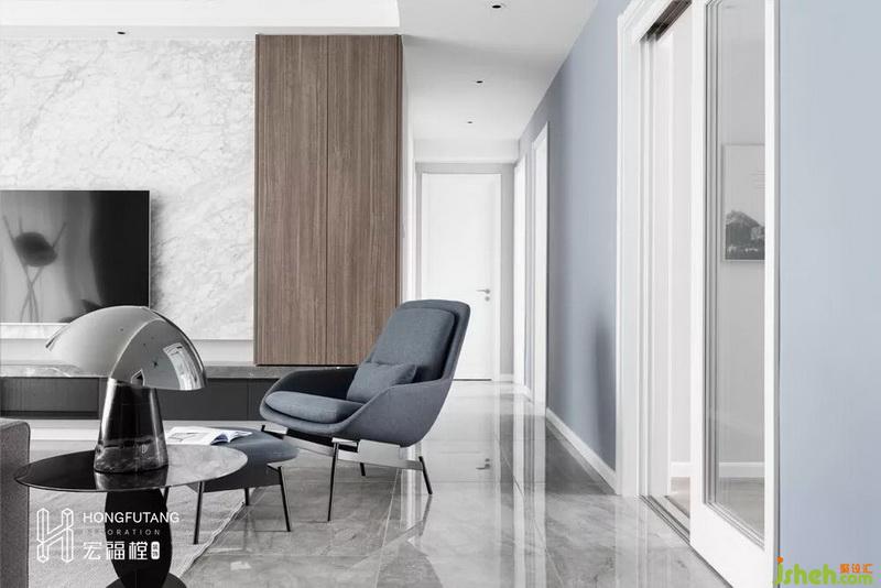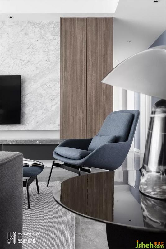 圆形茶几不会占用太多的空间,木质材质的使用使得低明度冷色系的空间有了温度,搭配地毯,带来归家的温馨感。客厅设立的躺椅也能满足业主日常阅读所需。