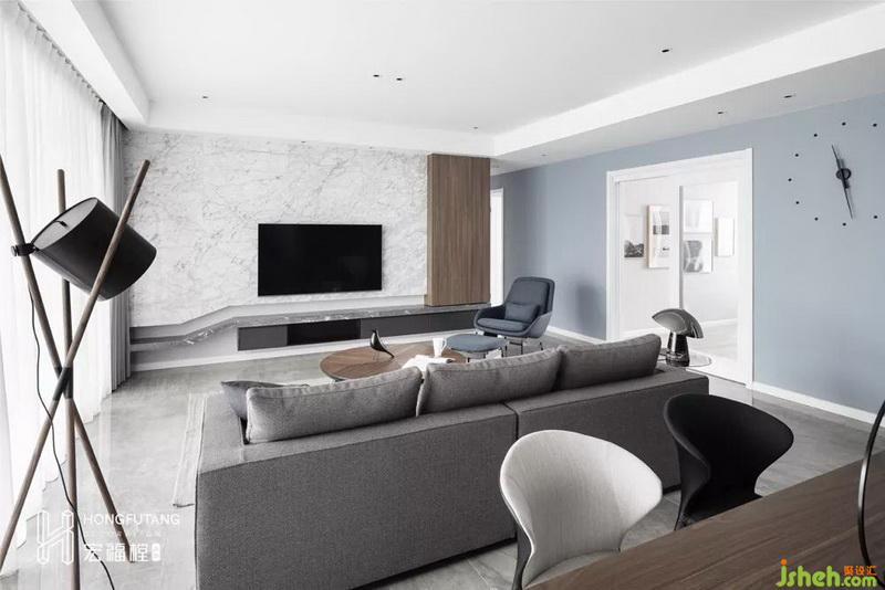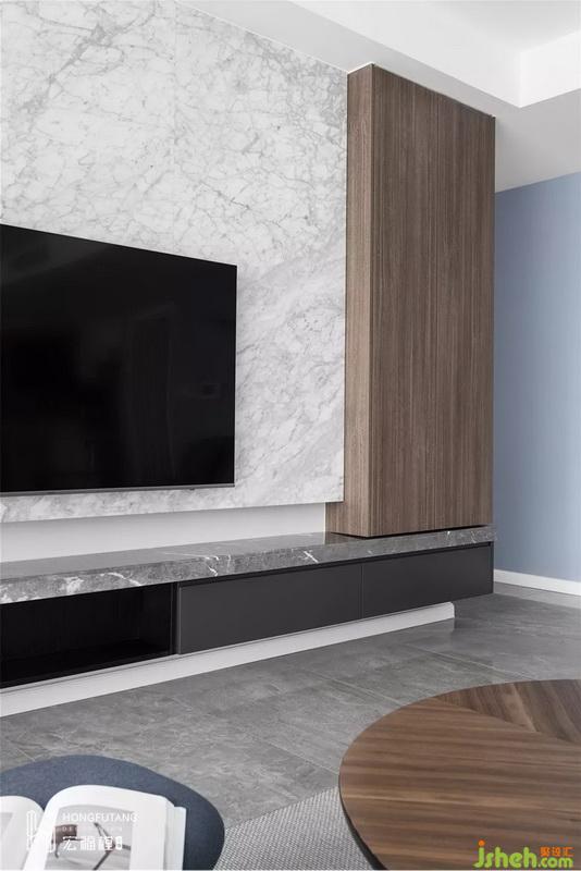 选用木质包边设计,电视墙质感多元化,大理石和木质搭配,利用自然纹理,空间线条感更强。