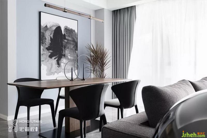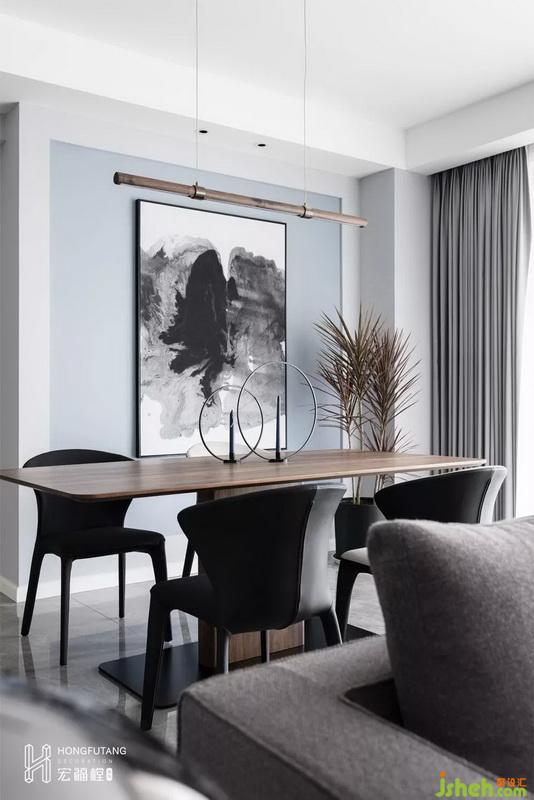 餐厅是团圆热闹的代表,选用木质餐桌将空间氛围烘托到最高点,与客厅元素相呼应。木质横向吊灯,满足了照射范围,简洁清爽;以水墨画丰富餐厅空间。以简单的物件呈现餐厅的合理搭配。