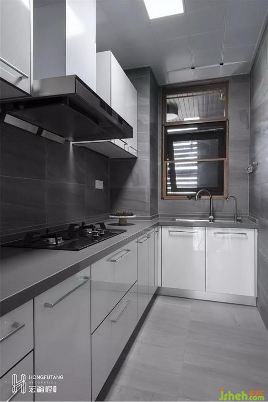 原始厨房空间有限,作为中厨使用,灰色波纹瓷砖的使用,增添空间纹理感,冷色调的运用综合了厨房的燥热感,从实用性方面来说,更耐脏。