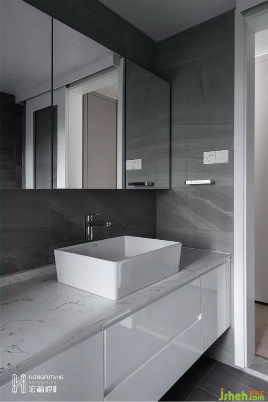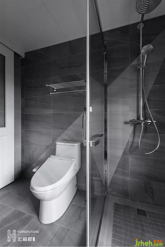 卫生间打破常规铺贴方式,选用几何形铺贴方式,营造空间立体几何感,区域划分清晰,符合数学老师几何思维。