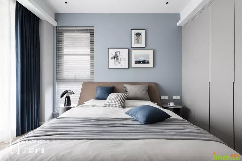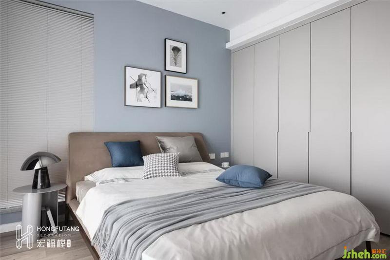 室内设计师在主卧延续客厅色彩,月光蓝带来的沉静感,使得主卧空间更加纯净、放松。