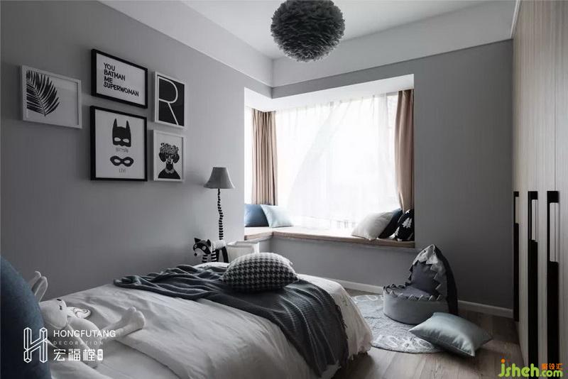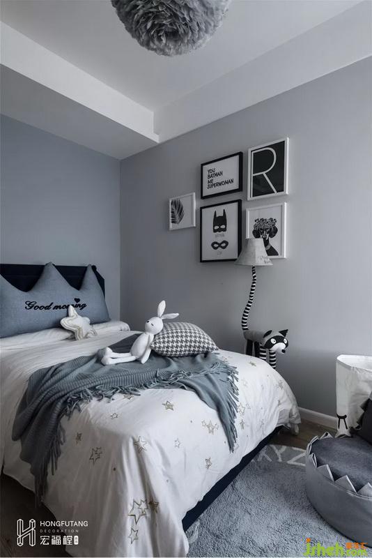 看似随意摆放的动漫壁画、宠物造型落地灯、鲨鱼懒人沙发,都是大人无法追逐的童年时光,从软装搭配上来看,空间充满童趣的同时也保证它作为休息区域该有的宁静悠闲。