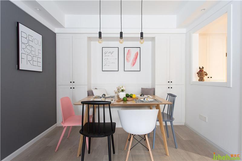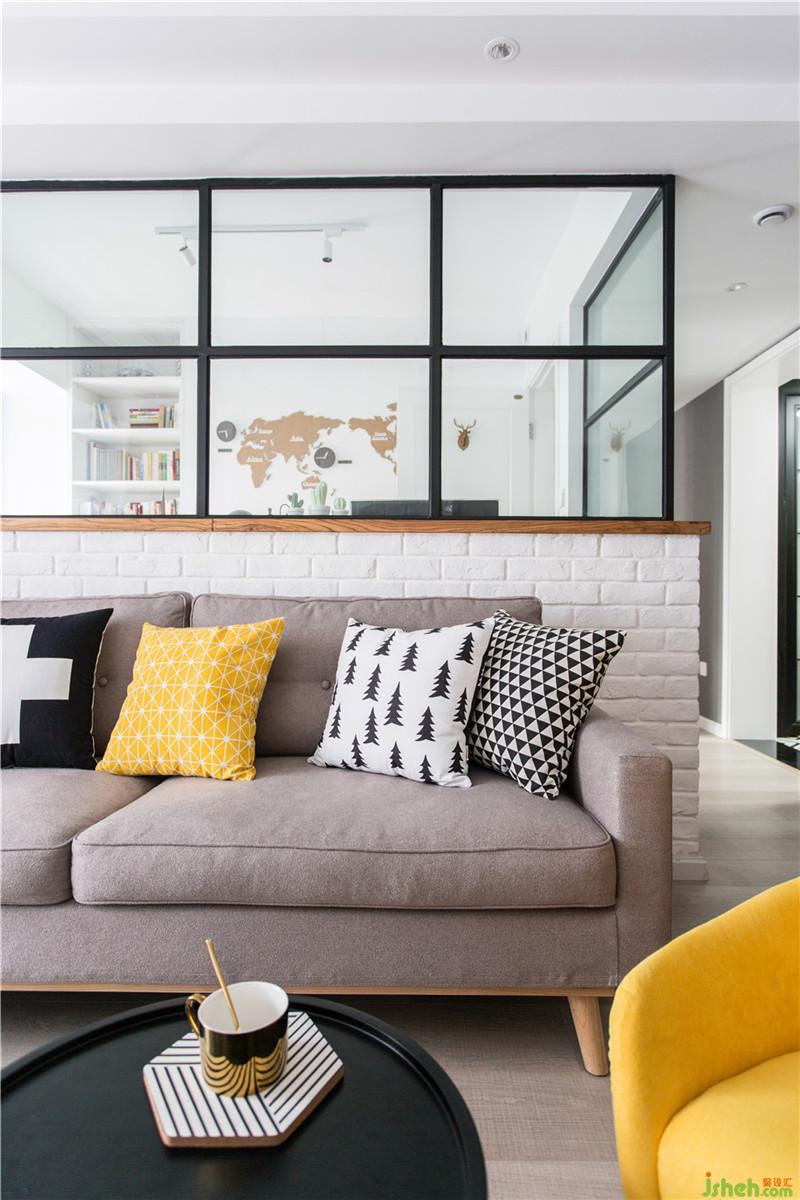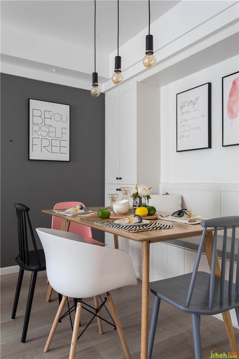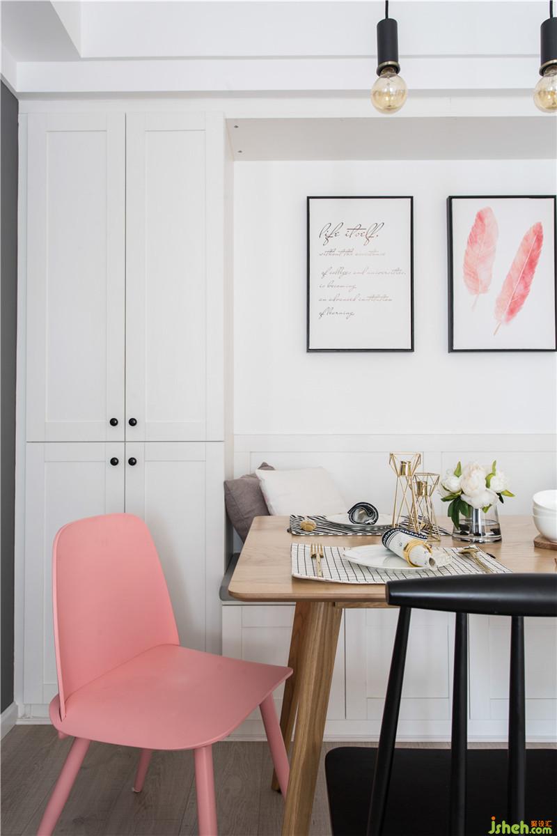 本案客厅空间范围小,客户喜欢纯净的颜色,空间硬装简洁,墙面使用白色,电视墙和沙发墙设计为文化墙,增加空间立体感,在软装点缀时使用黄色的靠枕、凳子来提亮空间色彩对比。这套房子整个户型非常方正,餐厅也不例外。餐厅与门口本是一面墙隔开,将黑框玻璃嵌入墙中,保留个功能区隔开的同时,也扩大了进门看到的范围。餐厅内设置收纳柜,既可充分利用空间,又可弥补大白墙带来的视觉空洞感,女主人喜欢的粉色、金色元素在餐椅、壁画、灯饰中体现。男主人工作特殊性,特地将客厅背后的小房间化外书房,用黑框玻璃隔开的客厅和书房,保证两个空间的各自独立性,又可增添家人间的感情。女主人喜欢的大片粉色在卧室体现,为提高卧室的舒适感,设计师将粉色色度调灰,采用灰色窗帘、家具,色调一致。女主人喜欢的大片粉色在卧室体现,为提高卧室的舒适感,设计师将粉色色度调灰,采用灰色窗帘、家具,色调一致。虽说房子看起来简洁,但每一处的设计都带有业主对实际生活丰盈的憧憬。室内设计师