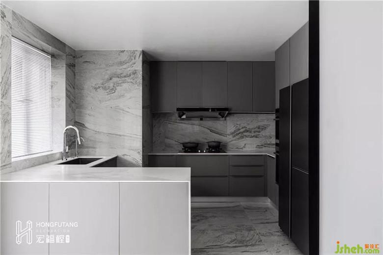 步入餐厅的空间,开放式L型厨房,家庭的生活重点。从情感上来说,此时的厨房不仅是单纯作为烹饪空间使用,更是一家提高交流和共情的最佳场所。从物理使用来看,开放式的厨房更能满足更多功能的使用,提高空间使用率,提高生活品质。