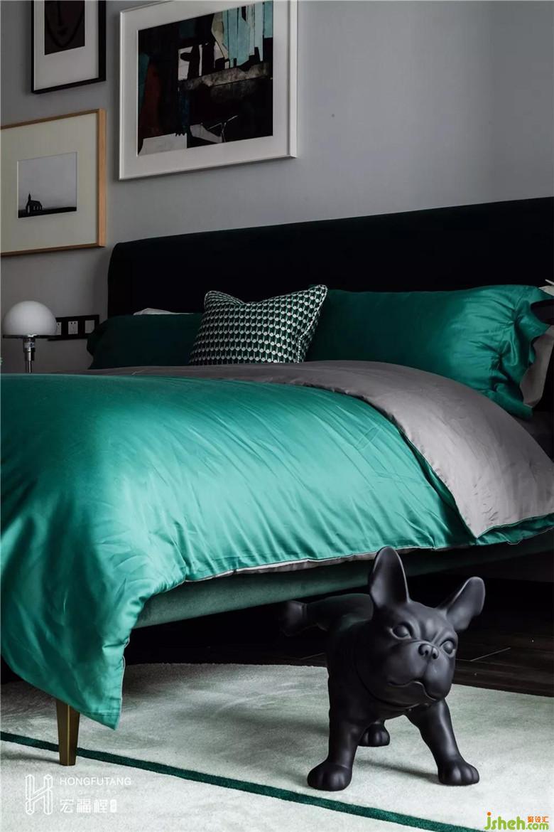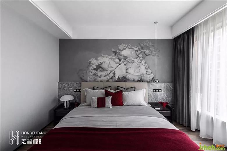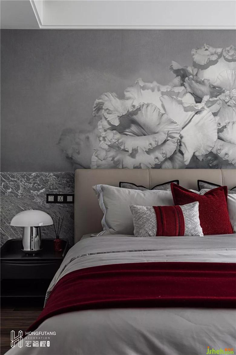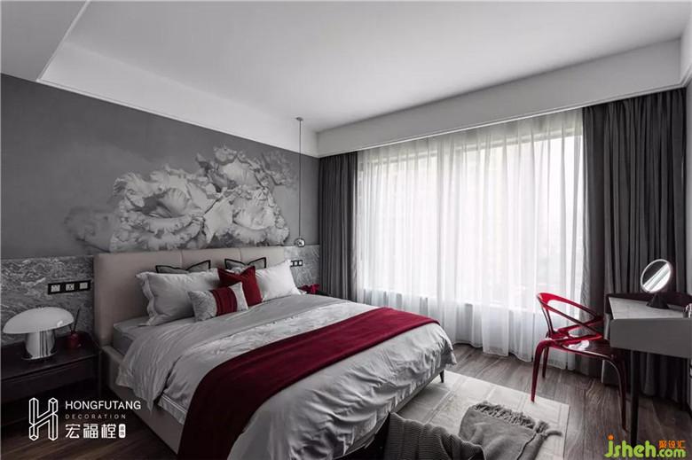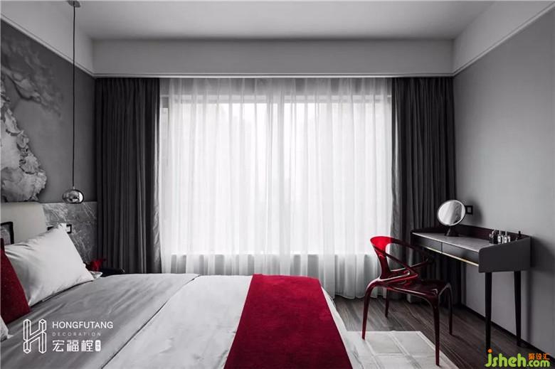 空间设计中,色彩是至关重要的因素,能起到传递情感和视觉提示的作用。伊夫圣罗兰曾经说过:“红色是令人惊奇的!”,红色系色彩充满生命力,满足了我们对于乐观生活和愉悦身心的诉求,为忙碌的生活注入一丝丝活力。主卧延续灰色调,以黑白灰来区分空间的重心,庞贝红作为填充色。抢眼的庞贝红成为主卧空间的点睛色,不需要占比过多,两者交融出的色彩张力让人难以抗拒,优雅而时尚,尊贵而霸气。