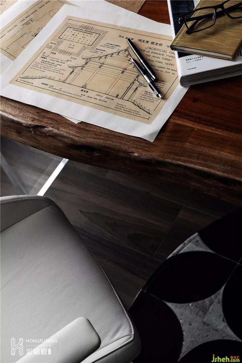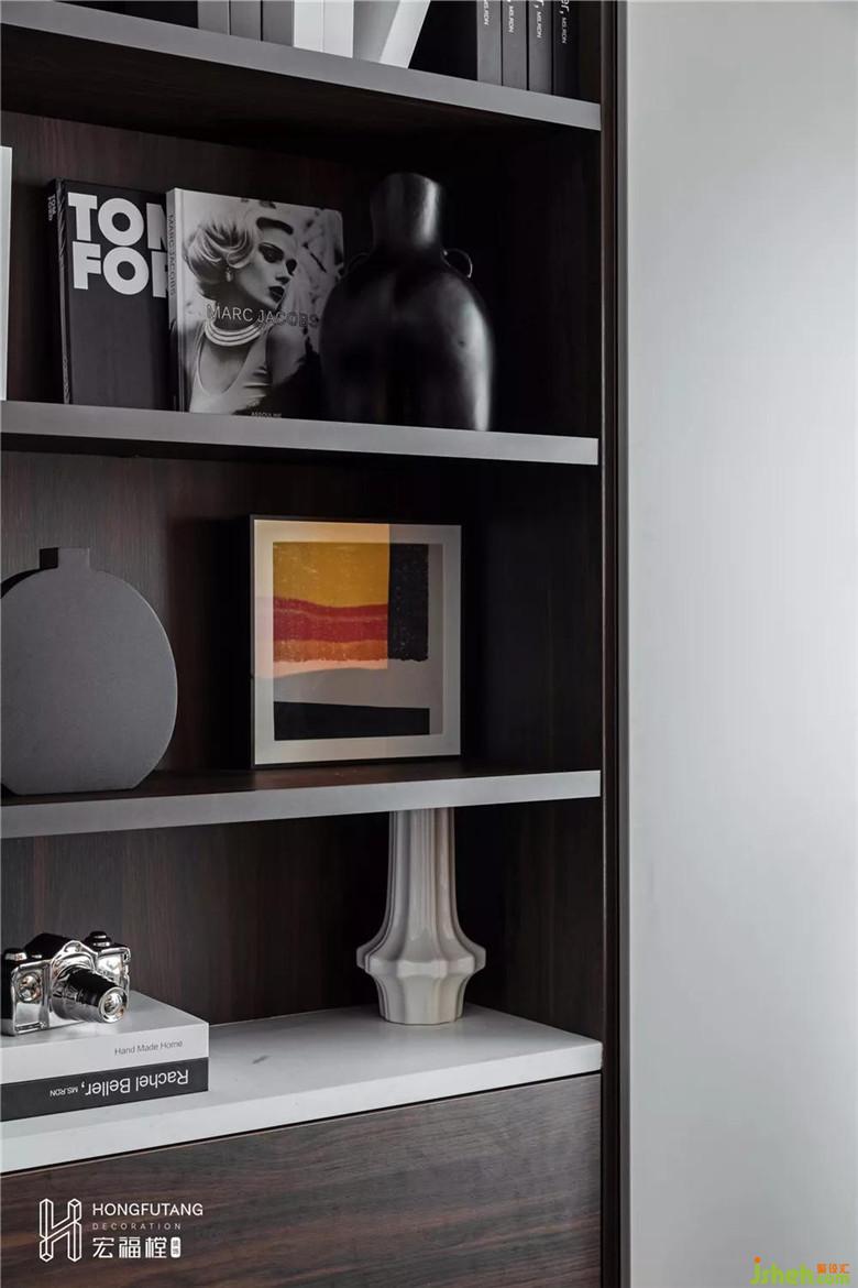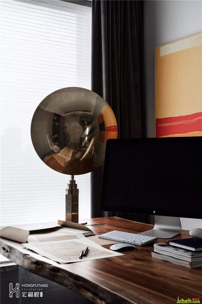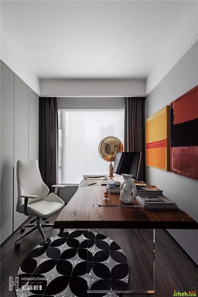 书房,它给人一种既深思熟虑又不失时尚的感受,丹麦黄铜台灯、黑白几何的牛毛地毯、罗斯科经典作品相互之间的叠加,色彩的交集,在高级灰空间的衬托下令人眼前一亮,令整个氛围更富有艺术气息。超大的工作台,采用亚克力支腿设计,充满了构成感,解放空间视觉,满足工作台面足够大的需求的同时,让空间更加的轻透。