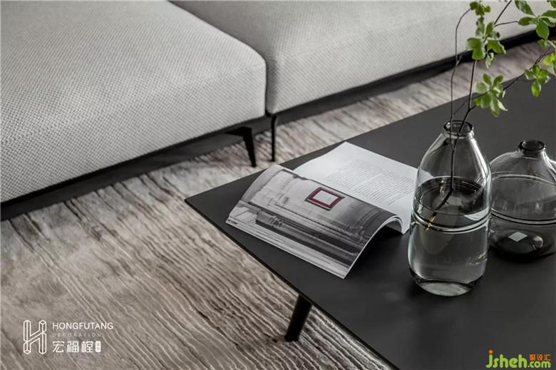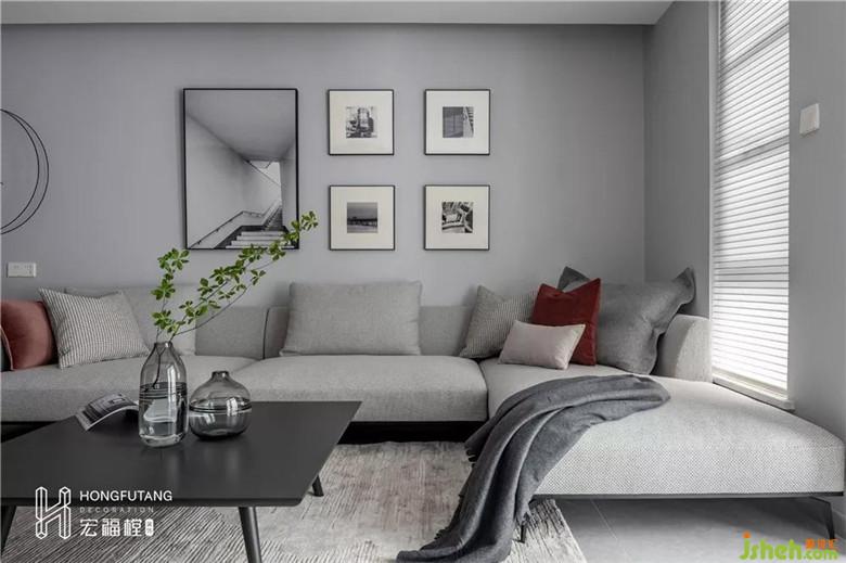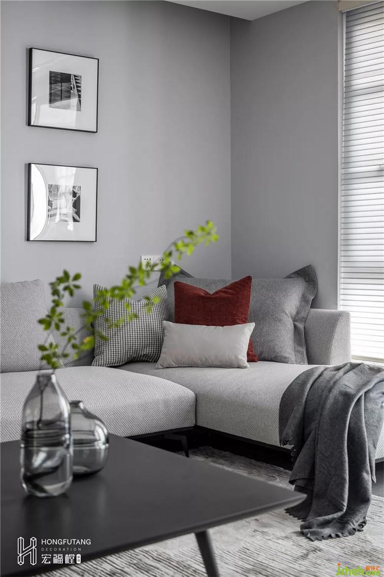 开阔的客厅选用灰色为主色调,不同纯度的灰色在墙壁、地板、沙发、软装处使用,呈现空间的一体感,空间视觉通透明朗。