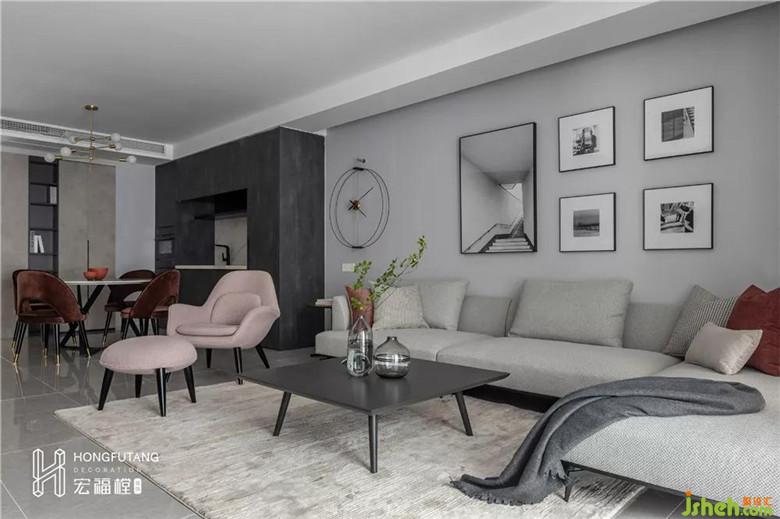 皮粉色、枫叶红作为小面积点缀色出现,提亮空间明度,热烈的颜色与灰色相碰撞,空间氛围活跃灵动。