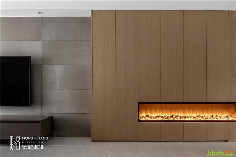 考虑到成都冬天的室温,传统的暖气管缺乏美观度,将壁炉嵌入客厅收纳柜中。壁炉橙与原木搭配提高空间的温度,也将壁炉作为整面收纳柜的点缀使用。