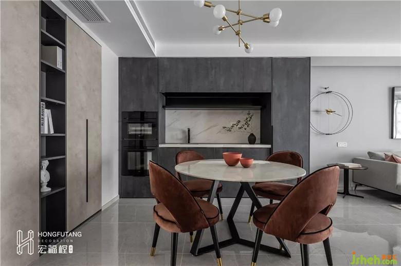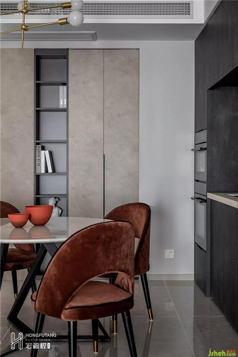 餐厅与客厅在同一空间内,餐厅面积充裕,靠墙两侧设立两组存物柜,满足收纳的同时,分担了厨房收纳的压力,也弥补空间的空白感;灰、白、棕三色的组合运用,冷暖搭配,保持与客厅空间风格一致的同时,也有了烟火气。