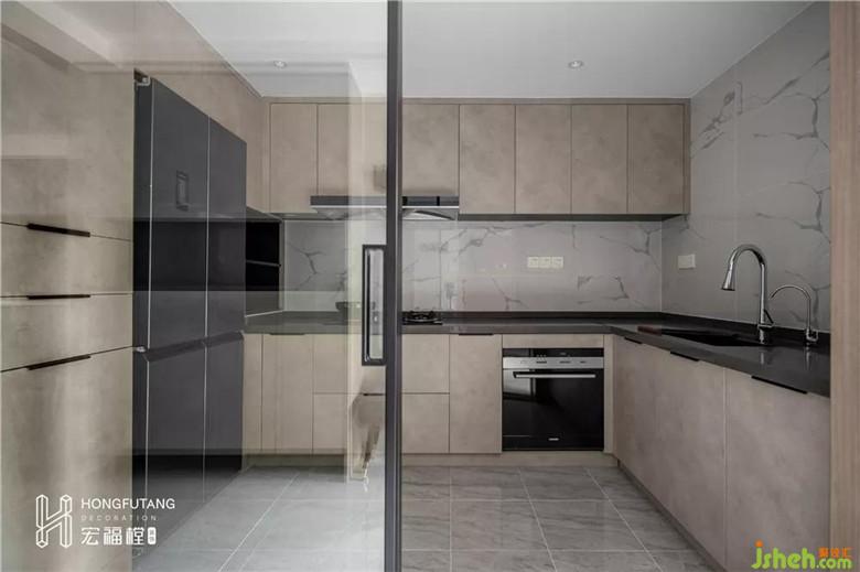 原始厨房布局不合理,采光条件有限,设计师拆除原有窗户,改变厨房动线,合理布局厨房空间,满足更多厨房器具的使用;推拉门的选用,使得厨房视野更加开阔,灰白色系的搭配延续整个空间的风格。