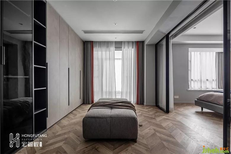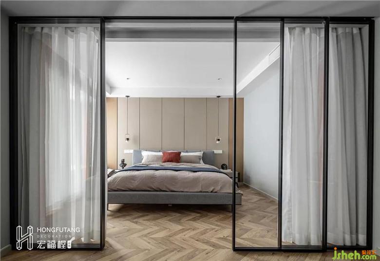 装修公司利用极窄边的玻璃推拉门进行空间分割,镜面交错的光影,让空间更显通透敞亮,卧室与衣帽间有了更加紧密的联系,增加了互动性;原木色鱼骨拼地板铺满主卧和衣帽间,鱼骨拼装倾斜的线条对整体空间都有一定的延伸效果,整体视觉更加广阔。鱼骨地板的选用凸显强烈的艺术立体感,鱼骨拼接具有超“颜值”的同时,也让空间充满优雅精致的魅力。