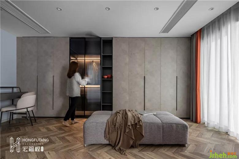 装修公司选用半封闭式的收纳柜,内部分区清晰明确,让所有大小衣物一目了然,满足功能性的同时也作为美学享受;充足的衣帽空间还能设立梳妆台。