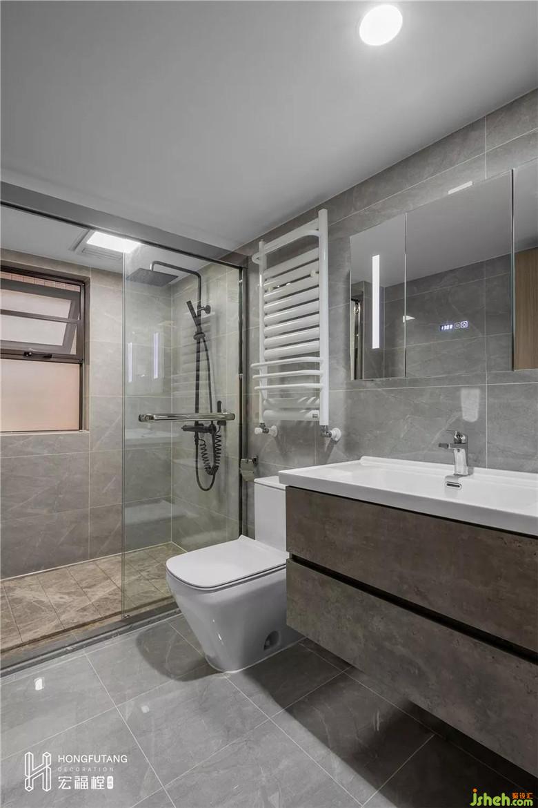 次卫使用频率相对较低,拆除原有隔墙,将洗浴和卫浴空间融入一体,增加了使用面积的同时,空间视觉更加开阔;选用灰色系全瓷砖贴面,容易清理的同时,品质感上升。装修公司