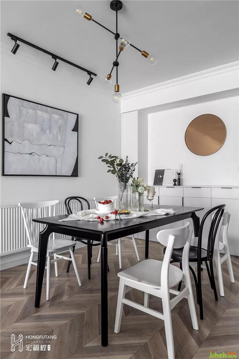 餐厅与客厅没有刻意区分开,所有都只是这个舒适空间的一部分,餐桌右侧的储物空间隐蔽且与墙面合成一体,干净整洁。随意放置几件饰品都可显得腔调十足,鱼骨拼地板则使空间充满了立体感。