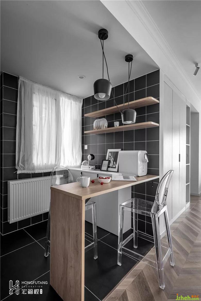 合并后的生活阳台摇身变成简易的早餐区域,在此泡一杯咖啡,烤两片面包,温暖的阳光从窗户透进来时,一天的生活在此开始变得美好。