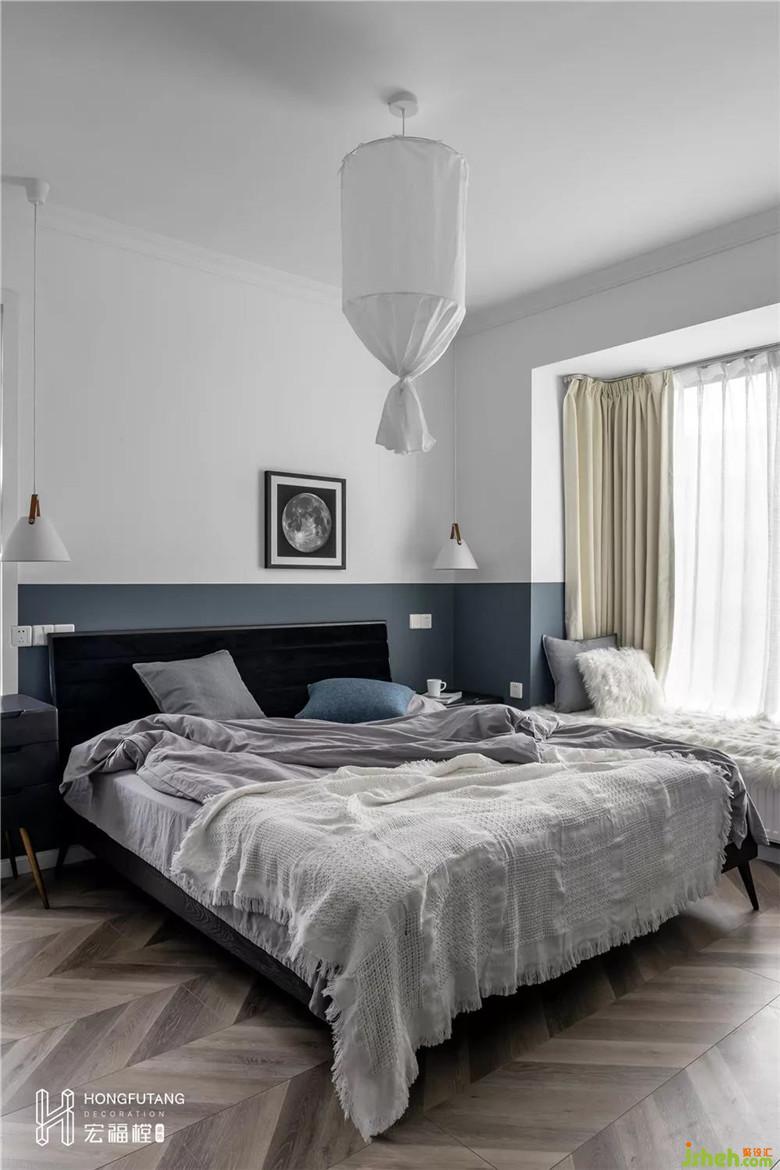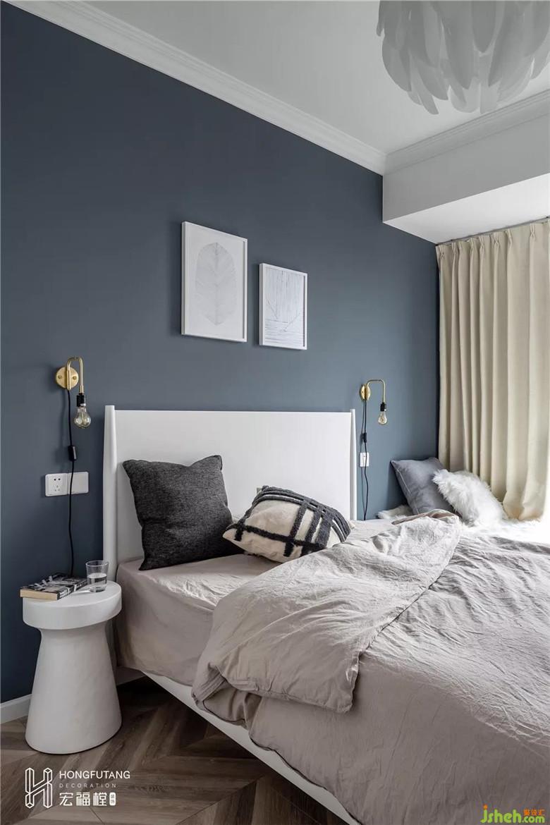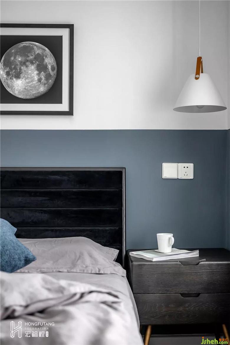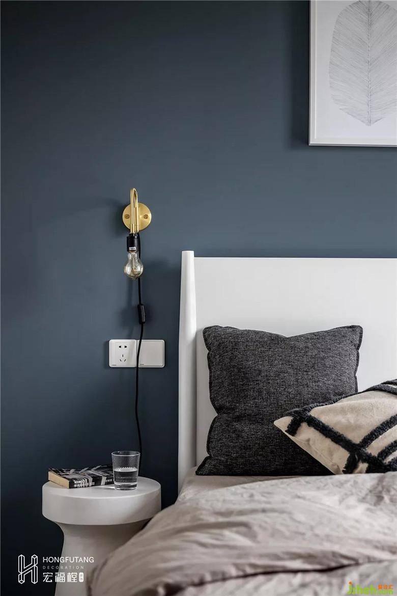 主卧以融入的蓝色调来纯粹静谧的睡眠气氛,棉麻质地的生活用品与木质床头柜的融合巧妙的让空间回归自然本身。