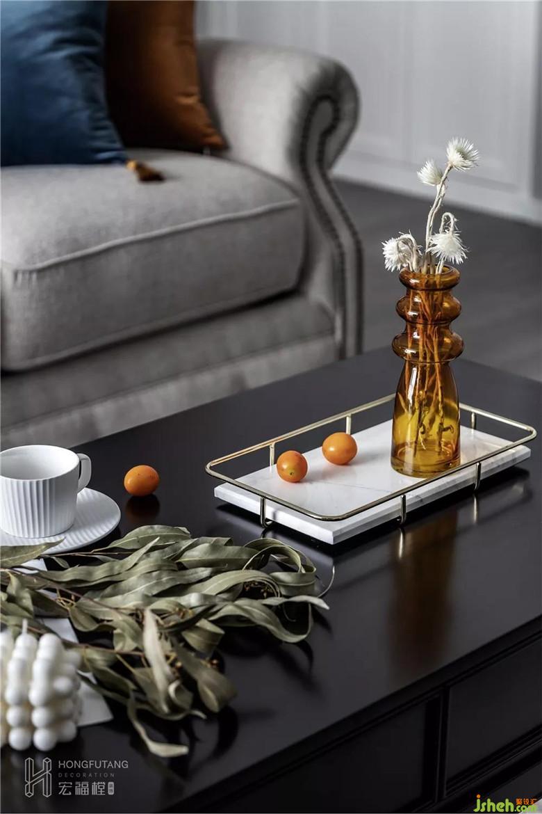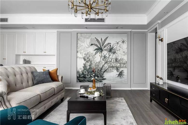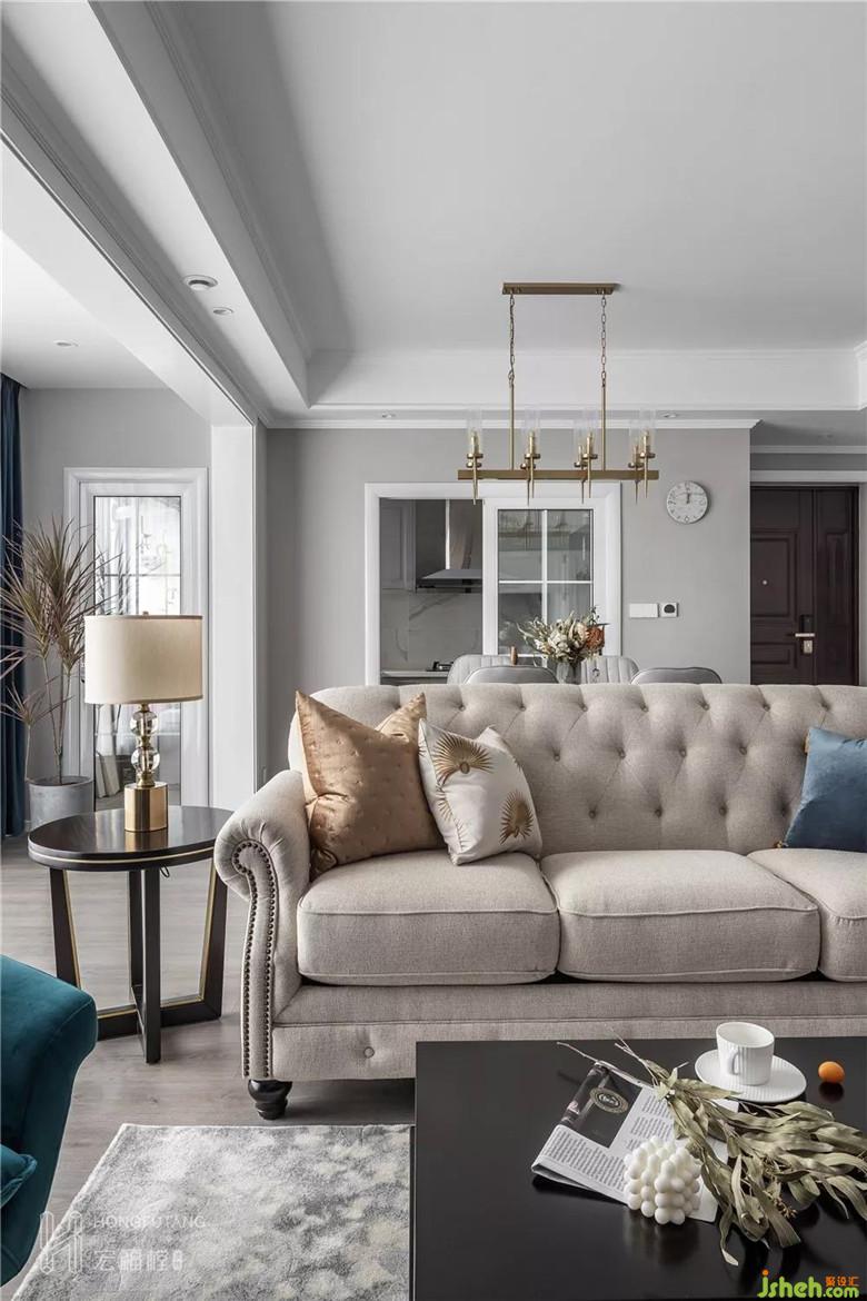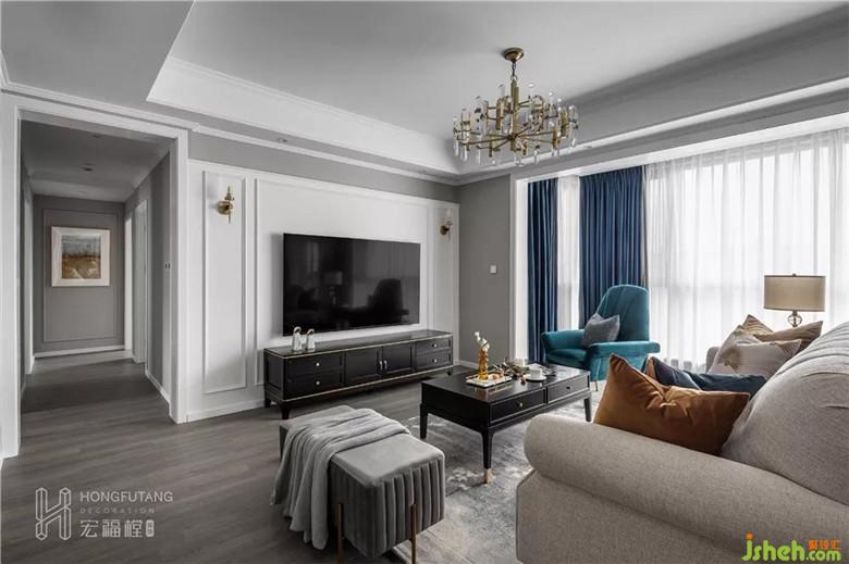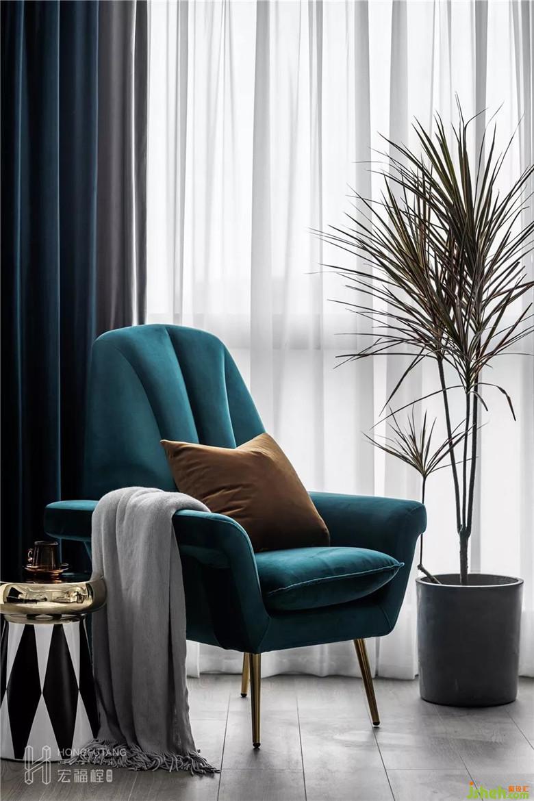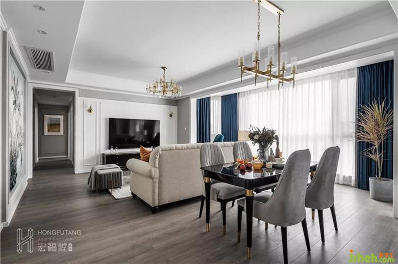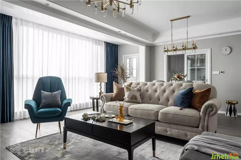 客厅的高级灰撞色窗帘的复古蓝,过道的造型及壁纸在这个区域里得以重用,凸显和强调时尚与优雅的高格调气氛。