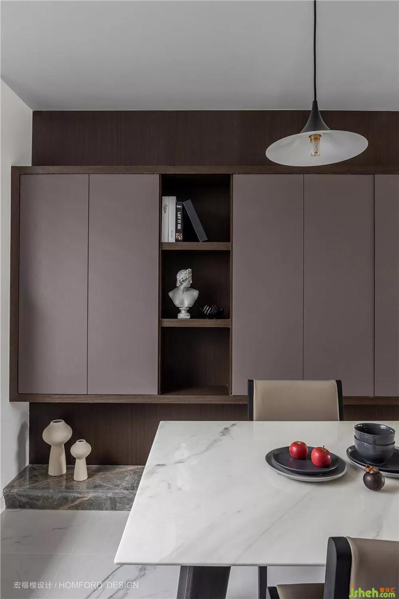 一侧的吊柜颜色与材质也与客厅相互呼应,在满足收纳需求的同时也是一件可供欣赏与闲时摆弄艺术品的区域。