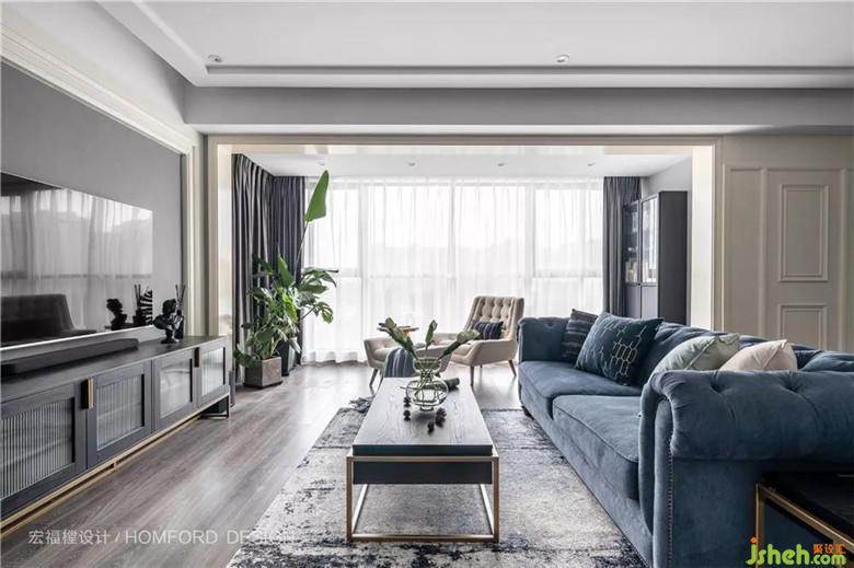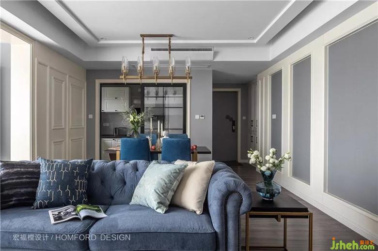 空间色调简约、硬朗。乳白和灰色营造柔和舒适的氛围,蓝色带来神秘、深邃和含蓄的空间感受。