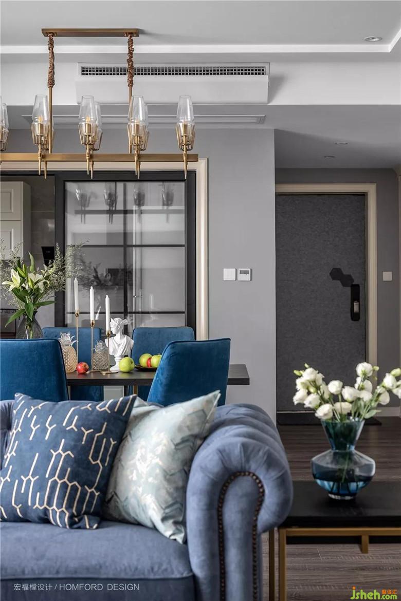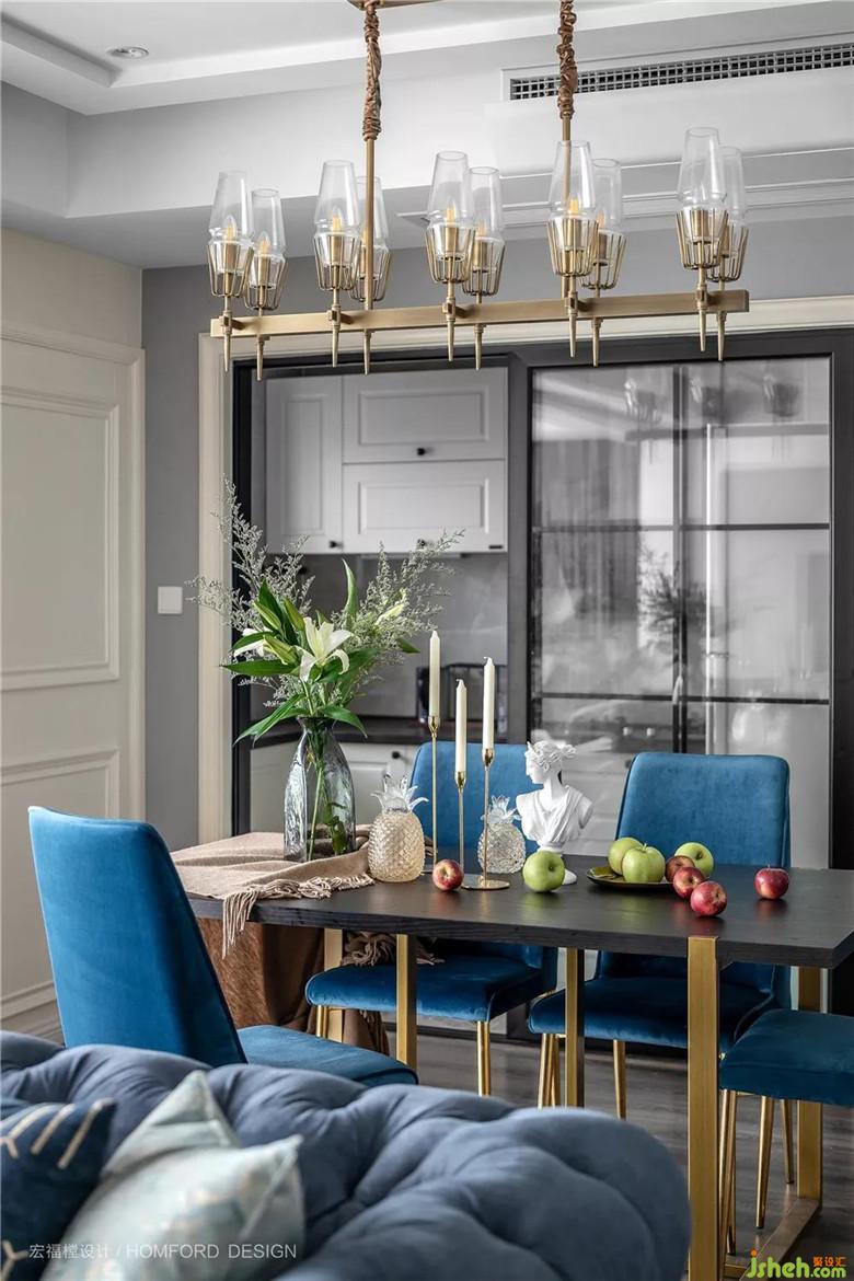 蓝色麂皮金属座椅呈现出后现代视觉与触觉的完美结合,在色彩上为就餐气氛带来趣味和动感。