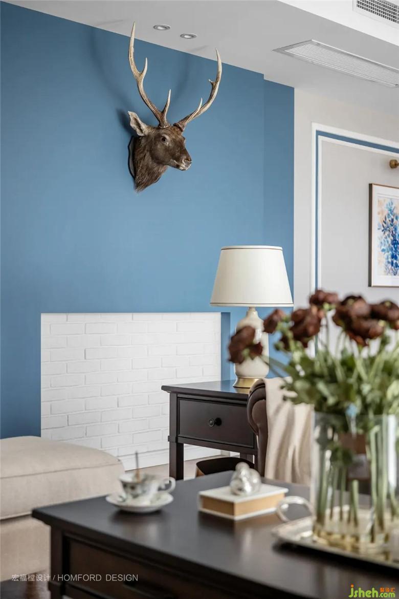 沙发通过同色系深浅不一的色调处理,钢蓝色为后退色、给人以空间整体向后延伸感,叠加文化石肌理,赋予空间一种动态韵律和美感。