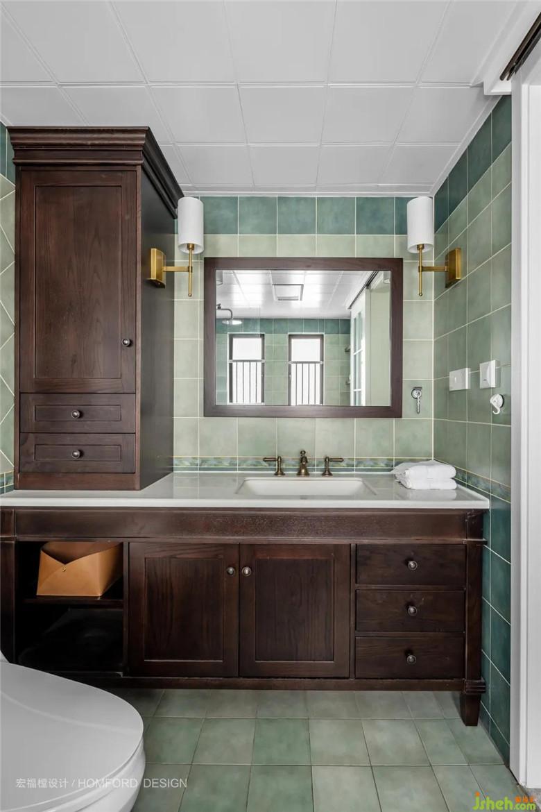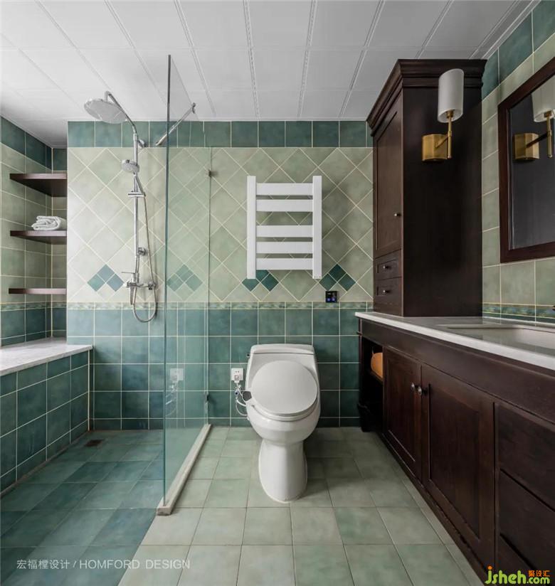 卫生间通过格局调整,在保证三分离互不干扰布局的同时,装修公司完美提升居住舒适度。薄荷绿系仿古砖、胡桃木定制浴室柜延续了主卧空间基调。