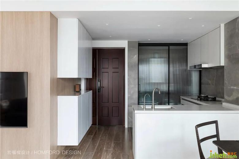 进门玄关处鞋柜做了中部镂空设计底部进行悬空处理视觉通透,一眼望去给人以明快爽朗的空间感受。