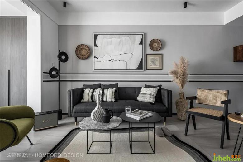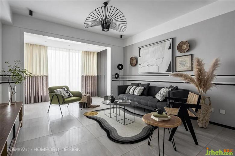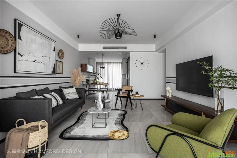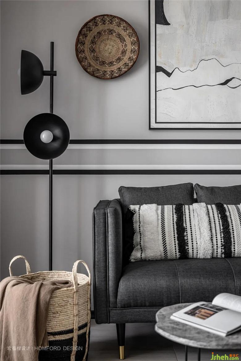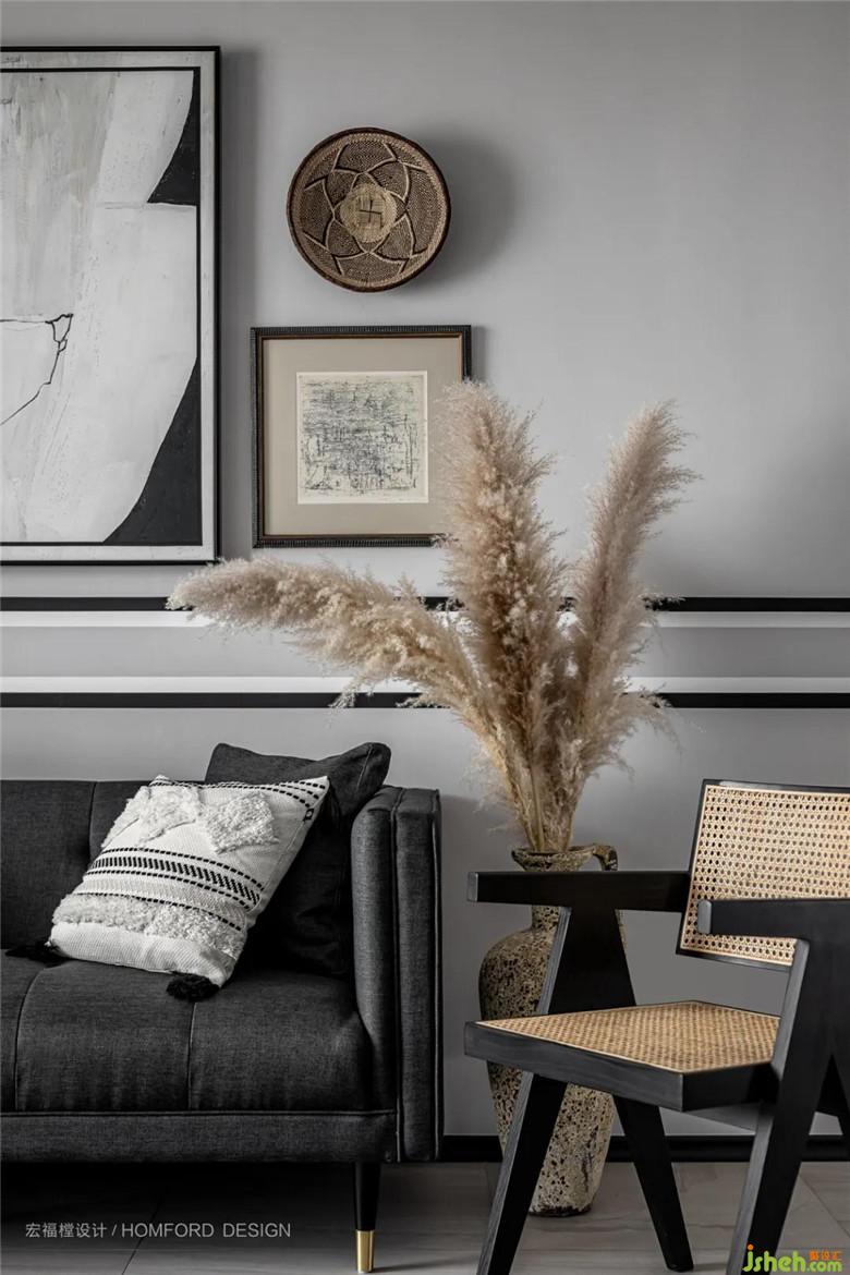墙面以白、灰为主,纹理自然的灰色瓷砖贯穿整个空间。纯手工拼色腰线以入户为起点,通过直线牵引出空间动线,使空间呈现出层次丰富的动态变化。时髦的现代气息中加入沉稳的黑白与自然气韵,营造出脱离现实感的艺术氛围。