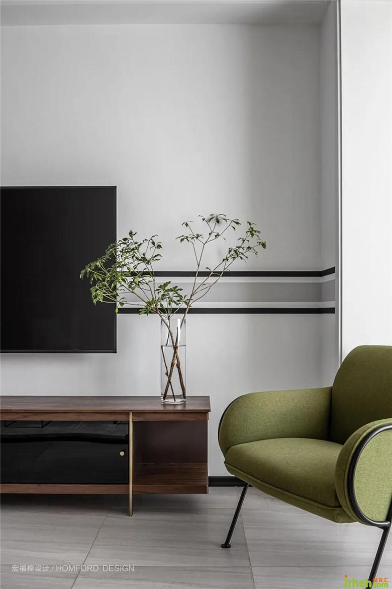 整体线条简单、用极简低饱和度色块进行区分。空间多处大面积留白、黑灰原木用以点缀,大量采用自然元素中的绿植、青苔、藤编材质装点,使空间氛围贴近自然的同时仍保留理性空间审美。