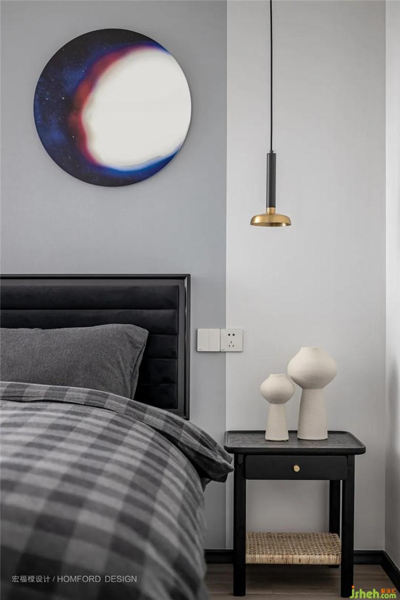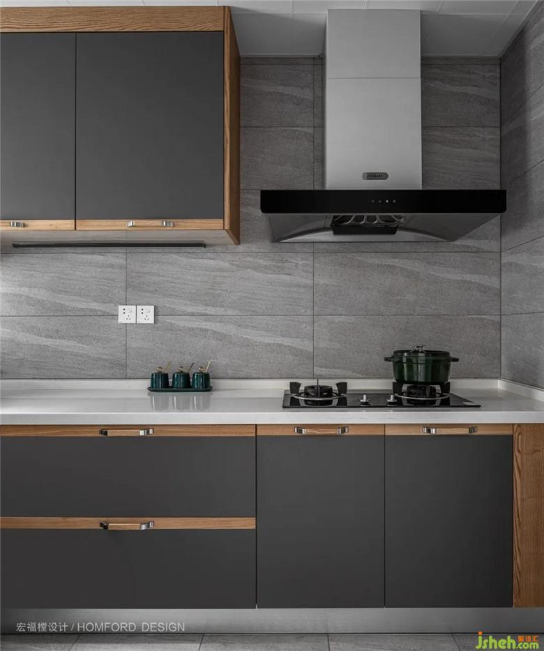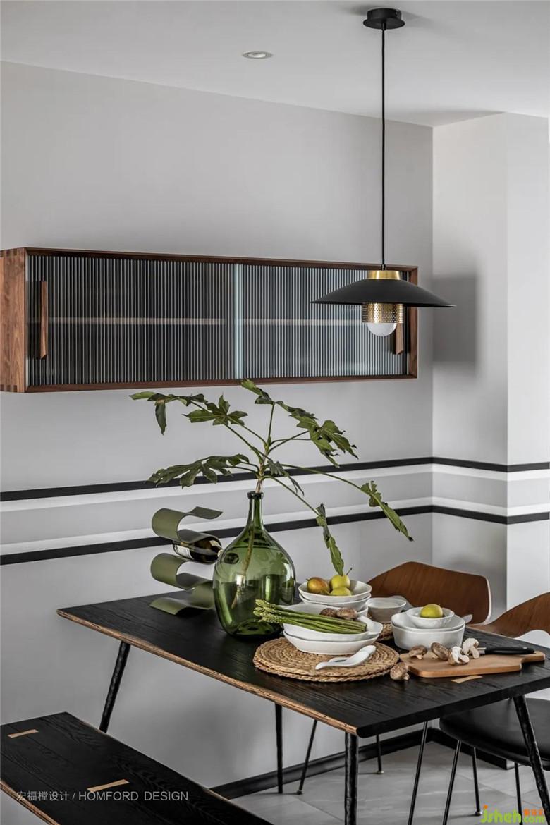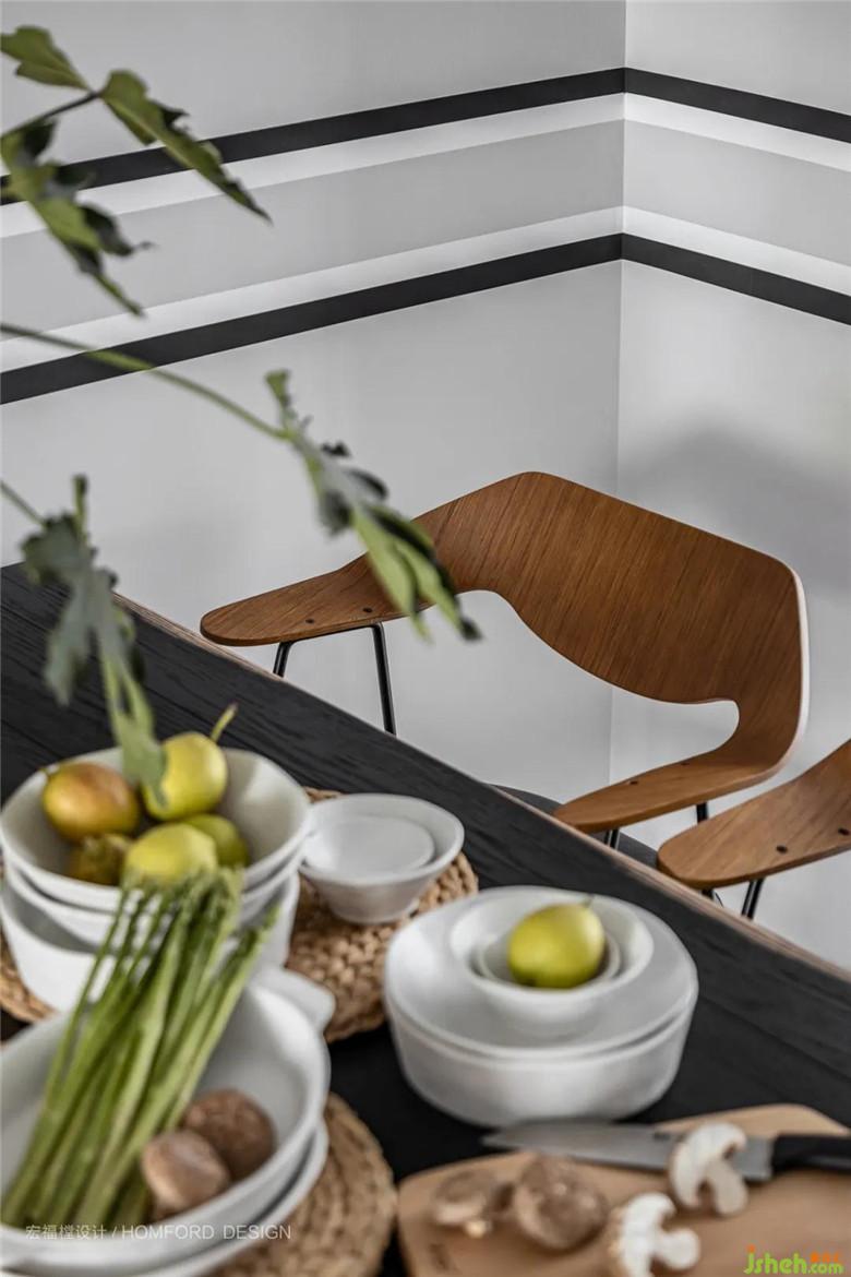 根据动线流畅上的考量,餐厅与客厅在同一空间,定制的餐厅柜与木纹肌理感的饭桌,整体感与环境完全相融,一切都呈现出与自然的和谐平衡。