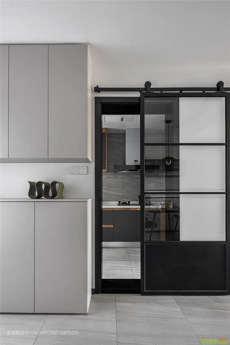 厨房与餐厅被一扇玻璃谷仓门隔开,延续黑白灰搭配木色风格。功能性与美学尽情展现于此,在进行美食探索的同时,北欧禅意式的精神与之相伴。