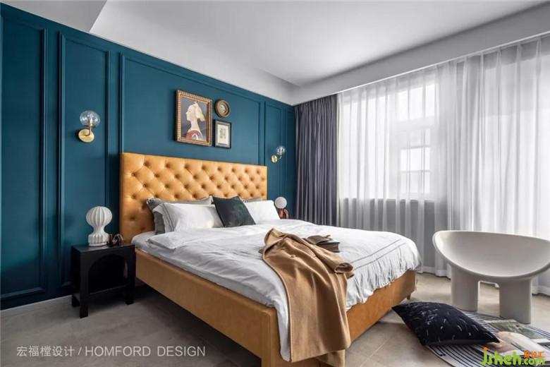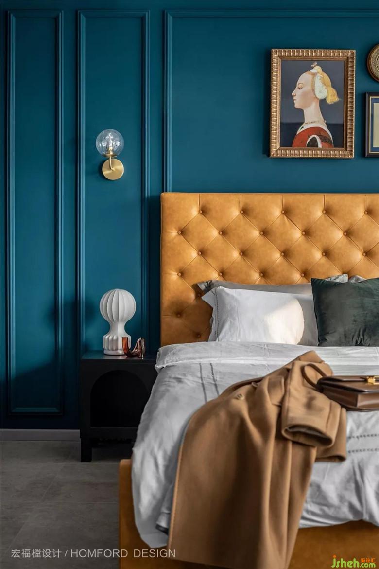 主卧室沿用客厅主调的孔雀蓝同样加上石膏线条组合、让空间富有节奏感、 再搭配太妃糖色高靠背床体、营造空间复古及高级感。