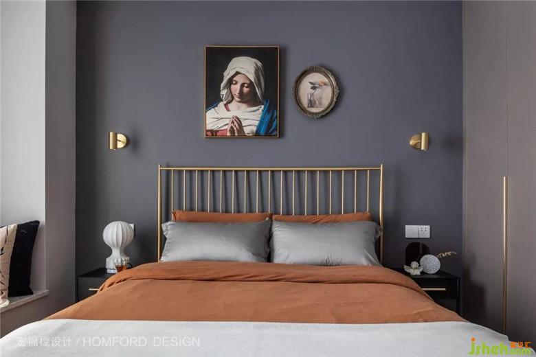 次卧由于加入了金属与复古挂画,让整个房间时髦起来。去繁就简,让本不太宽敞的空间瞬间舒展开来。