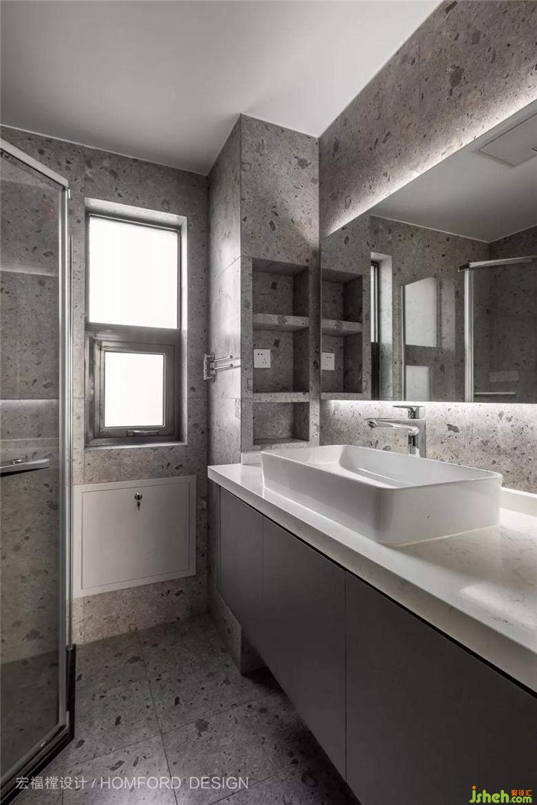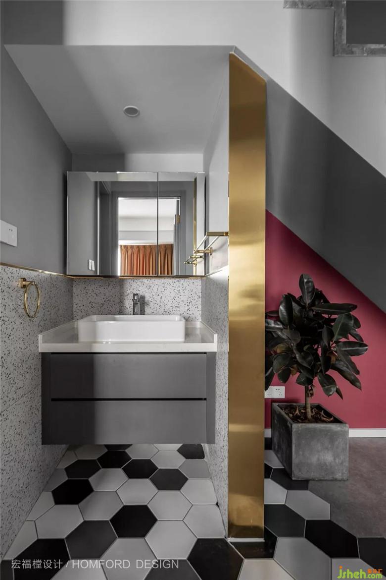 而主要卫生区域为屋主打造出最流畅早起刷牙动线,水磨石瓷砖搭配深灰柜体,时尚复古。我们希望赋予每一个空间,哪怕卫生间也是一种视觉享受,迷人的生活美学就这样一步步完成。
