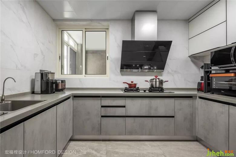 原厨房面积局促且因煤气设备问题无法改动,为尽可能争取使用空间,我们封闭了原生活阳台入口(现窗户位置)扩大了约1.6m地柜面积。