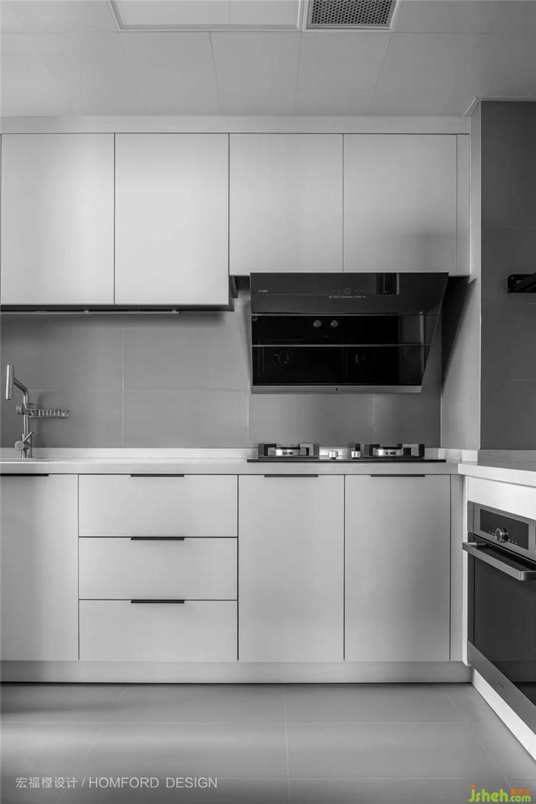 极窄黑框推拉玻璃门后是人间烟火气,厨房整体黑白分明,宽敞明亮。借用小小2.5㎡阳台空间,让使用舒适度翻番。