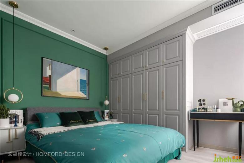 我们在主卧部分采用了对称设计手法,床头柜和吊灯自然形成镜像效果,复古墨绿色和整个空间融合,再搭配中性灰,质感十足。
