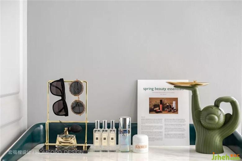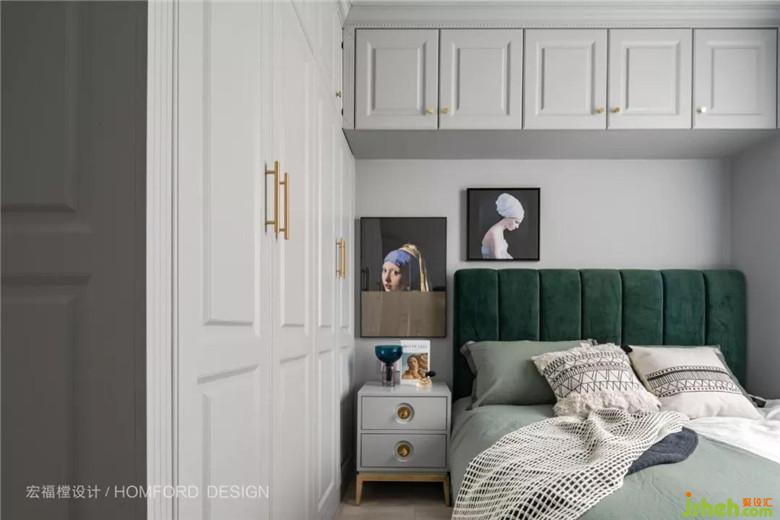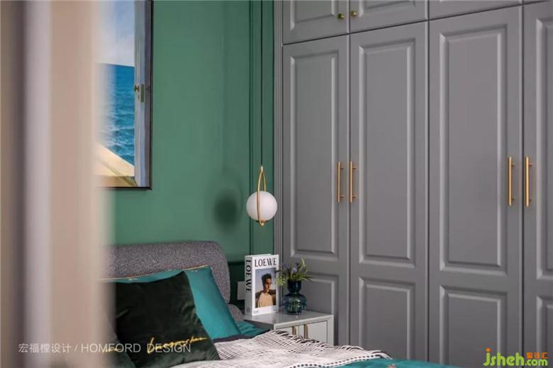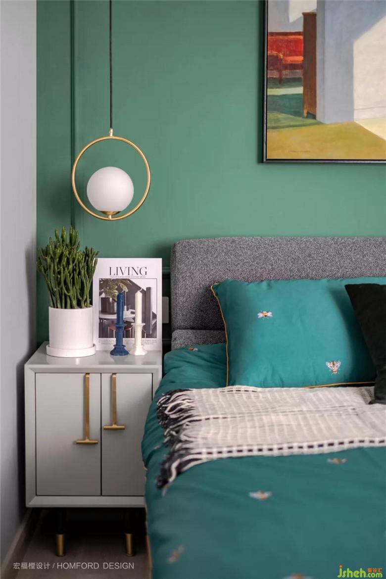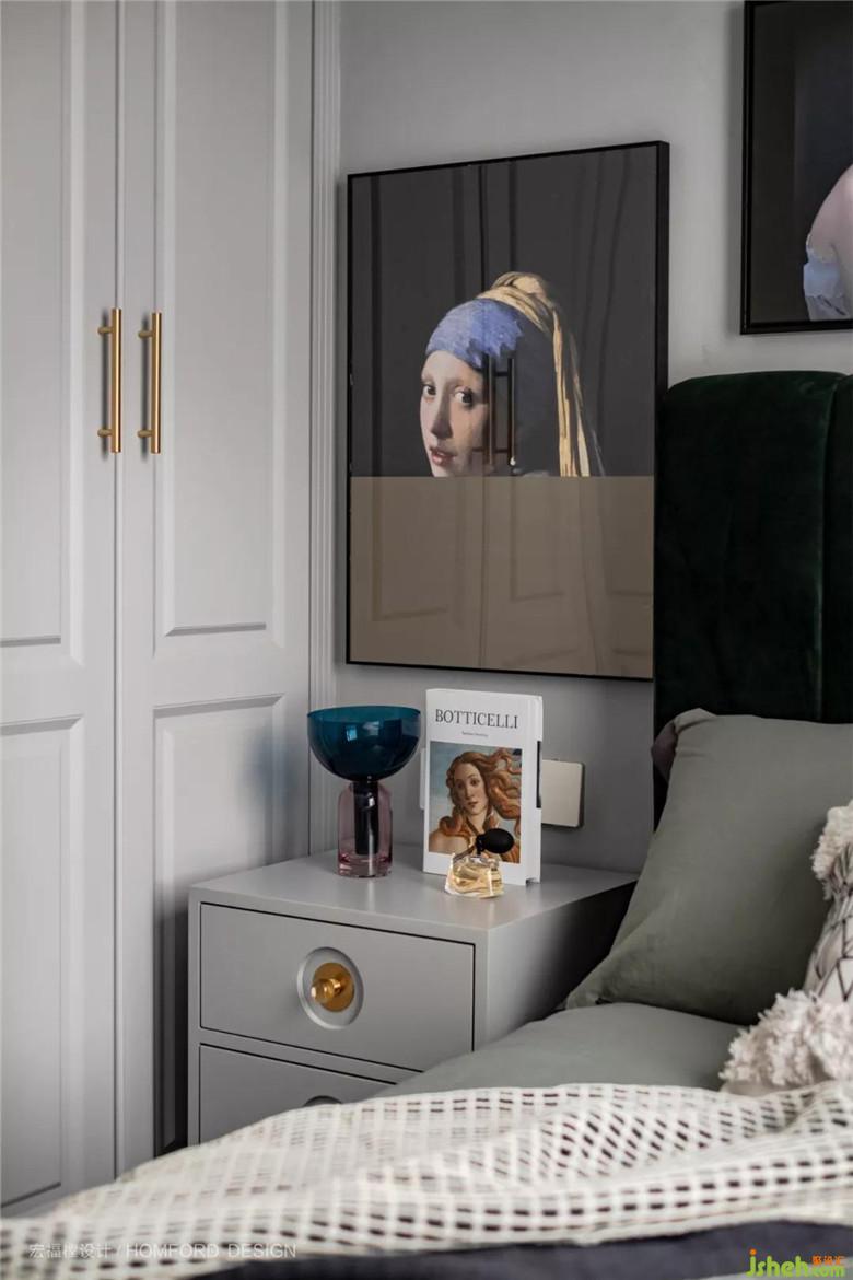 次卧精心挑选的复古人物挂画让空间的品味得以提升,墨绿色加上金属元素,让复古混搭视觉更强烈。