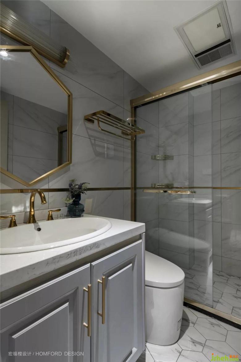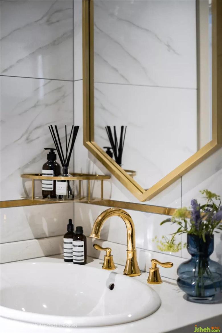 卫生间选用大理石瓷砖全贴,搭配黄铜元素,简约干净中又非常有时尚感。