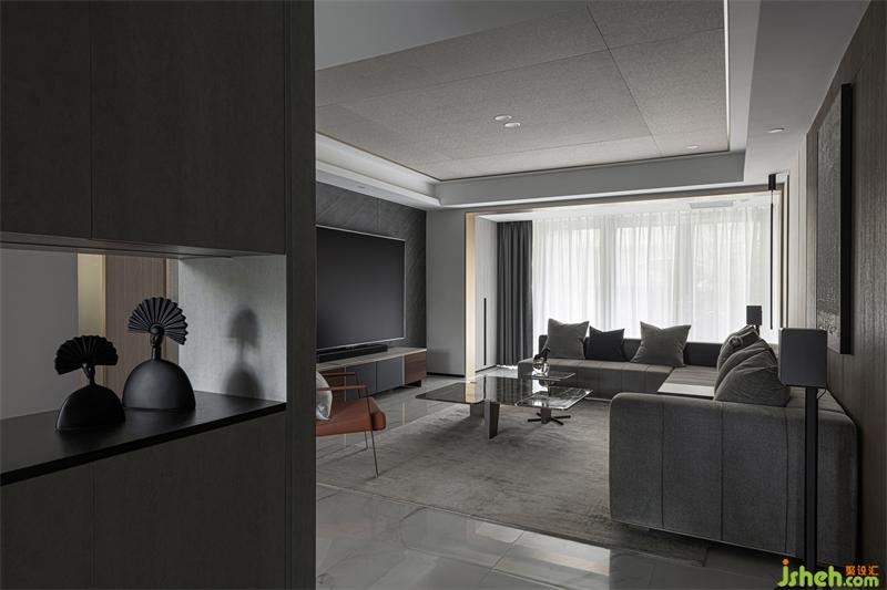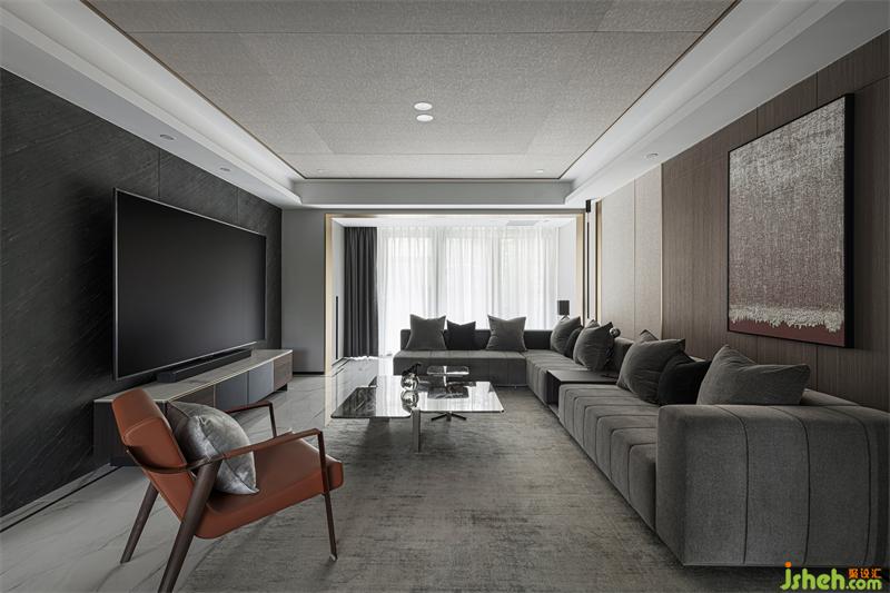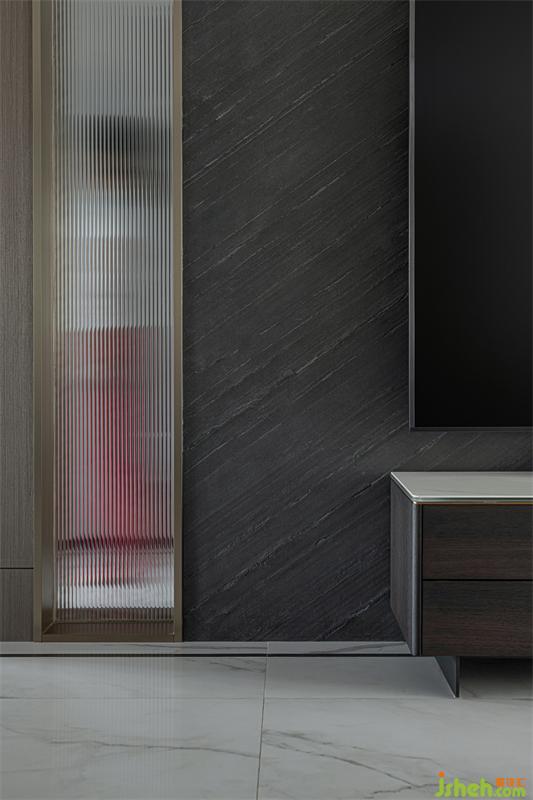 我们调整楼梯布局后客厅空间得以释放,增加电视墙横向尺寸,完美解决了原结构两面背景墙的比例分割不合理问题。确保比例协调再利用长虹玻璃独有的透光性,营造出若影若现的穿透效果。