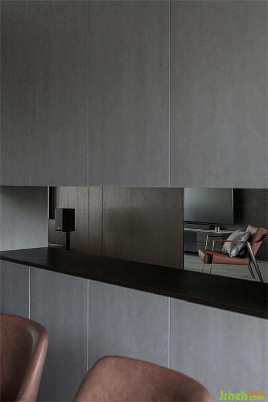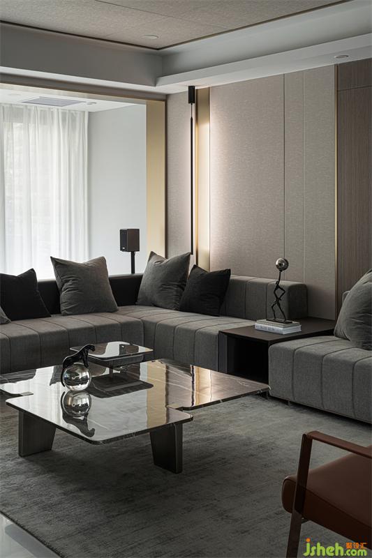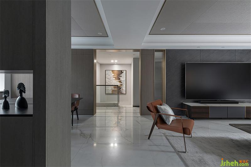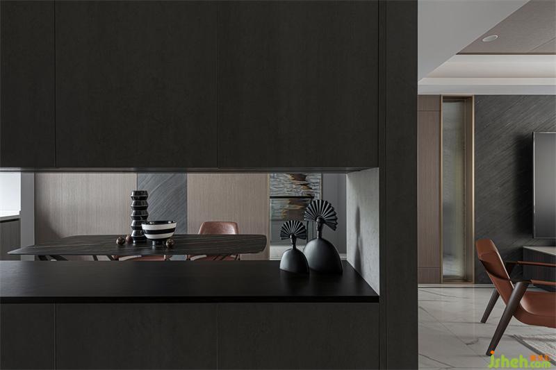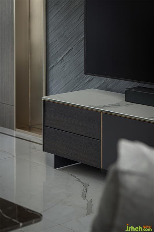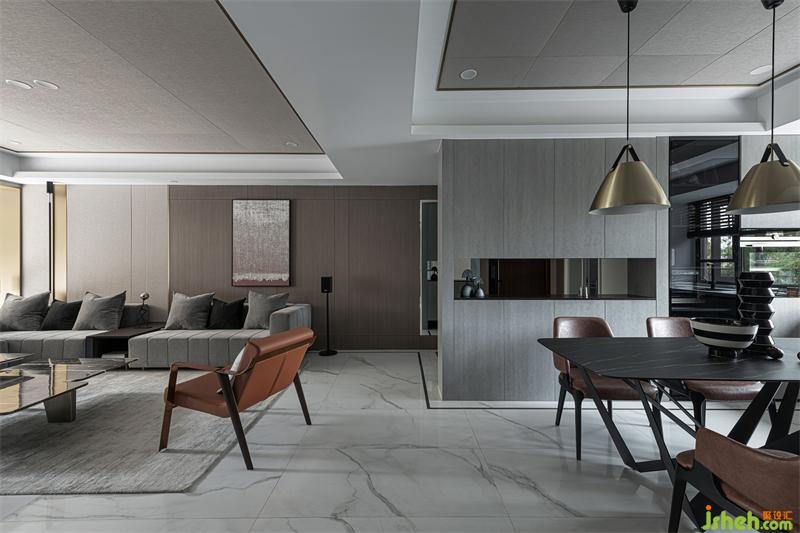 饰面材质贯穿整个客餐厅空间,各区域相互呼应同时保有相对独立性,石材、金属材质的穿插,让原本乏味的空间更具律动感与趣味性。