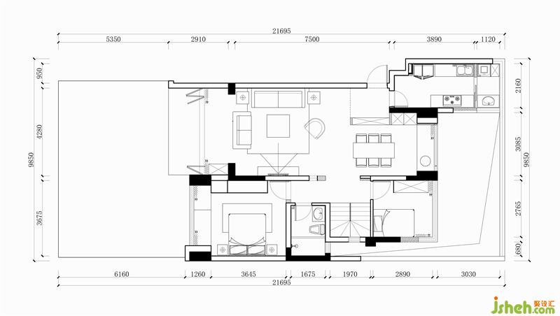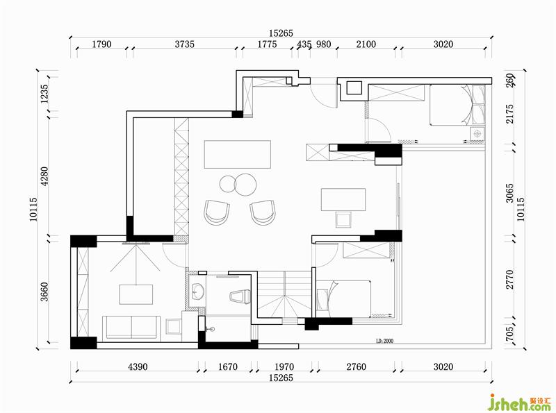 原玄关右侧为楼梯,从使用舒适度和美观性上都显鸡肋。于是我们将正对玄关侧方的次卫改成了楼梯间入口。无论从访客还是居住者本人的空间活动路径来讲都更加合理,客餐厅厨房为公区,以楼梯为界,两侧卧房为私区,公私分区动静明确。