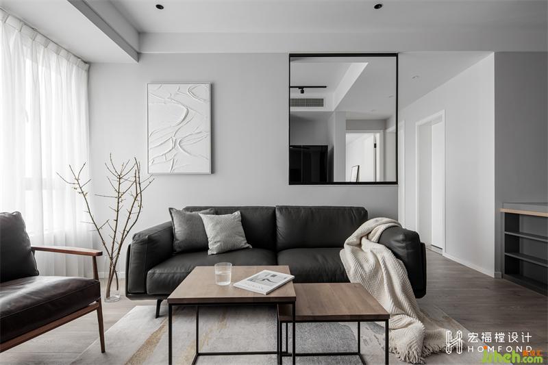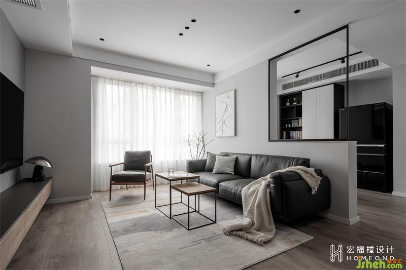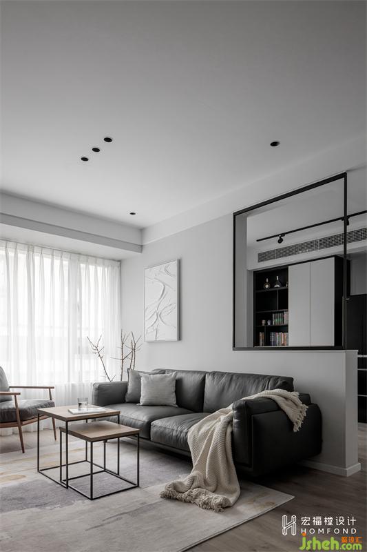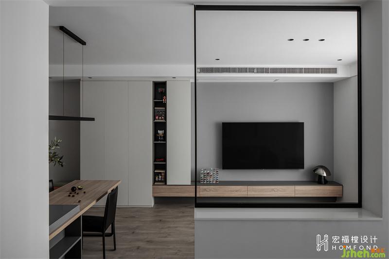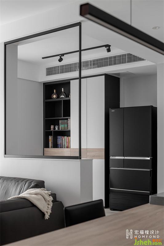 书房改造为开放式,并将客厅的墙面破开宽1300mx高1100mm面积,延伸空间视觉,扩大公共区域面积。打破传统设计理念,选择镂空,利用极窄边框进行框景,让空间、人与人之间,更具交互感。因屋主的生活习惯是较少使用厨房,并将水及零食存放于冰箱,所以我们将其放置在外,生活动线更为方便。