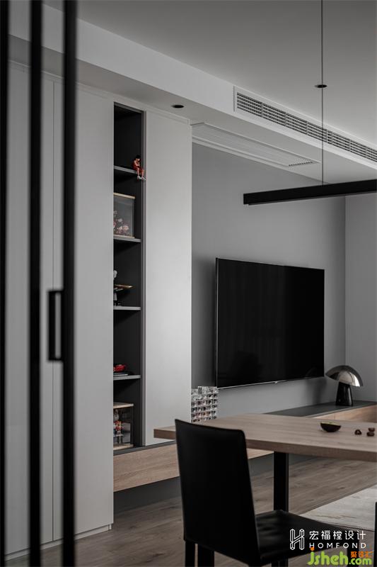 满足正常储物需求后,电视墙从左至右以一种递减视觉压抑感的方式呈现,储物柜与展示柜占据墙面2375mm,其余2890mm留白。