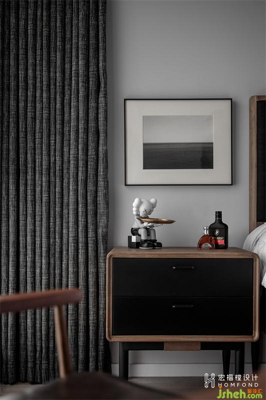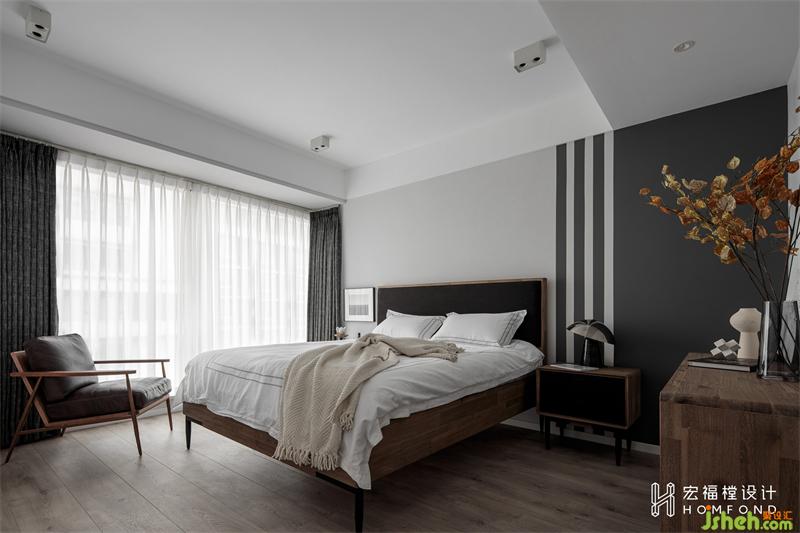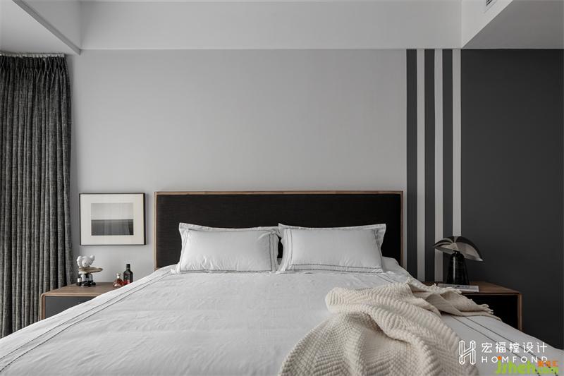 按照屋主意愿,家居设计将卧室的主卫拆除,面积与次卧均分,主卧空间增大的同时将次卧设计为独立的衣帽间。延续公共区域色调,减少物品的陈列堆放,墙面右侧进行线条分色处理,与左侧窗帘进行平衡融合。